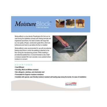 MoistureBlock is a low density Polyethylene film that can be used during the installation process with floating laminate and engineered wood floors. No need to bother with large fold-out, low quality, off-spec, construction grade films, which are bothersome and hard to use before the floor is installed.