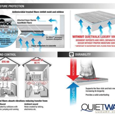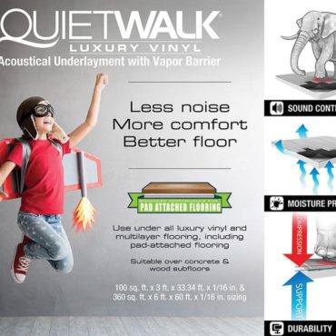 QuietWalk Luxury Vinyl is a 100 sq. ft. premium recycled fiber underlayment built for luxury vinyl plank, luxury vinyl tile and multi-layer flooring. Suited for both floating and glue down installations either in residential and commercial applications. Impressive sound ratings (providing exceptional through-the-floor and footfall noise protection) make this underlayment the ideal underlayment to be installed under LVT, LVF and MLF flooring; with STC rating of 62, IIC rating of 70 and Delta IIC of 28.